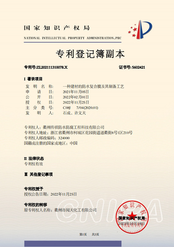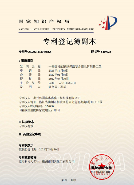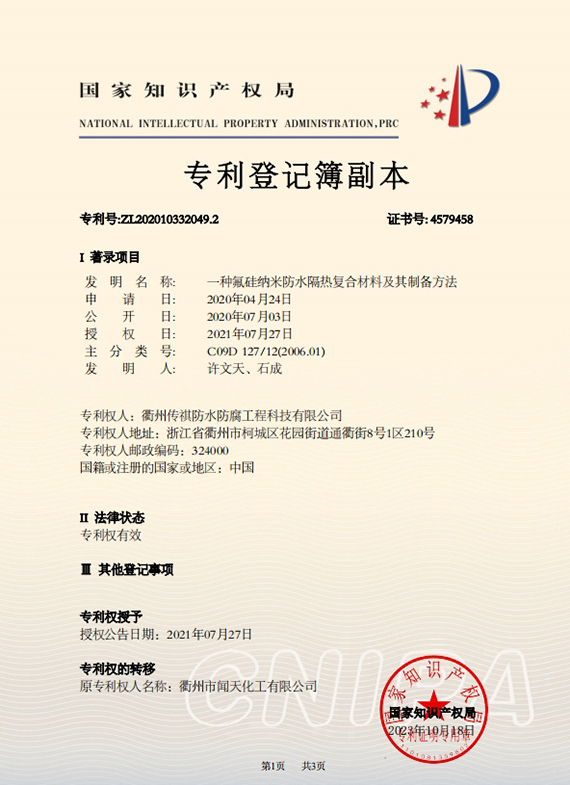 衢州傳祺新材料科技有限公司是衢州市聞天化工有限公司的下屬企業(yè);衢州市聞天化工有限公司成立于2003年,是國(guó)內(nèi)最早研發(fā)、生產(chǎn)氟碳涂料的企業(yè)之一。衢州傳祺新材料科技有限公司成立于2017年,公司專注于高分子氟材料的開(kāi)發(fā)和含氟材料在防腐、防水領(lǐng)域的應(yīng)用。經(jīng)過(guò)6年的不懈努力,已獲得了化工和建筑領(lǐng)域六項(xiàng)國(guó)家發(fā)明專利授權(quán)和兩項(xiàng)新產(chǎn)品科技成果獎(jiǎng),參與了中國(guó)建筑材料流通協(xié)會(huì)《房屋修繕?lè)浪こ桃?guī)范》標(biāo)準(zhǔn)的編制工作,中建協(xié)涂裝委員會(huì)浙西工作站設(shè)立在我公司。